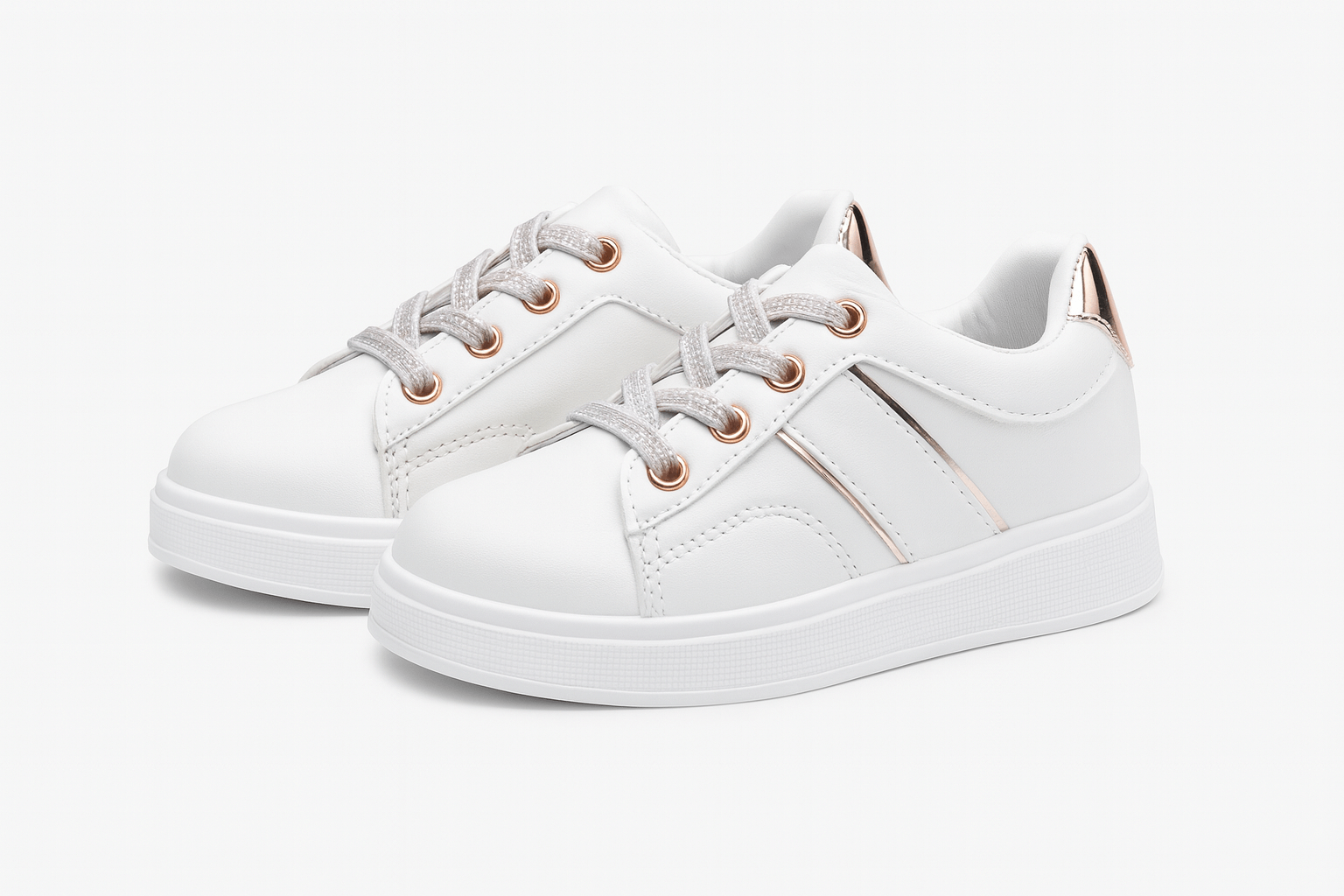 סניקרס לבנות בעיצוב נקי עם נגיעות זהב ושרוכי גומי מנוצנצות.