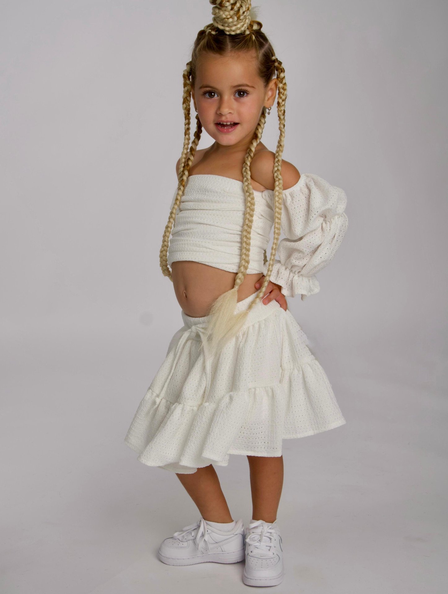סט חצאית מסתובבת וטופ כיווצים מבד רך ונושם.