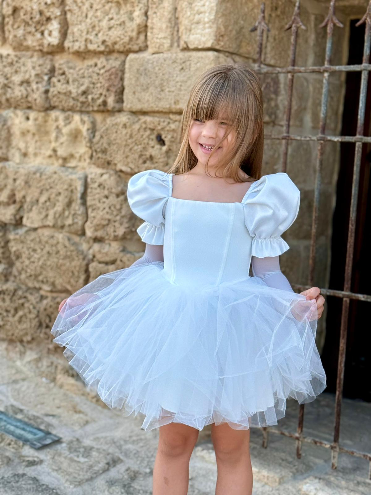 שמלת טוטו מתופרת משלובת בד פודנש, בד סטן בוהק ויוקרתי, שרוולים תפוחים, ופפיון גדול בגב.