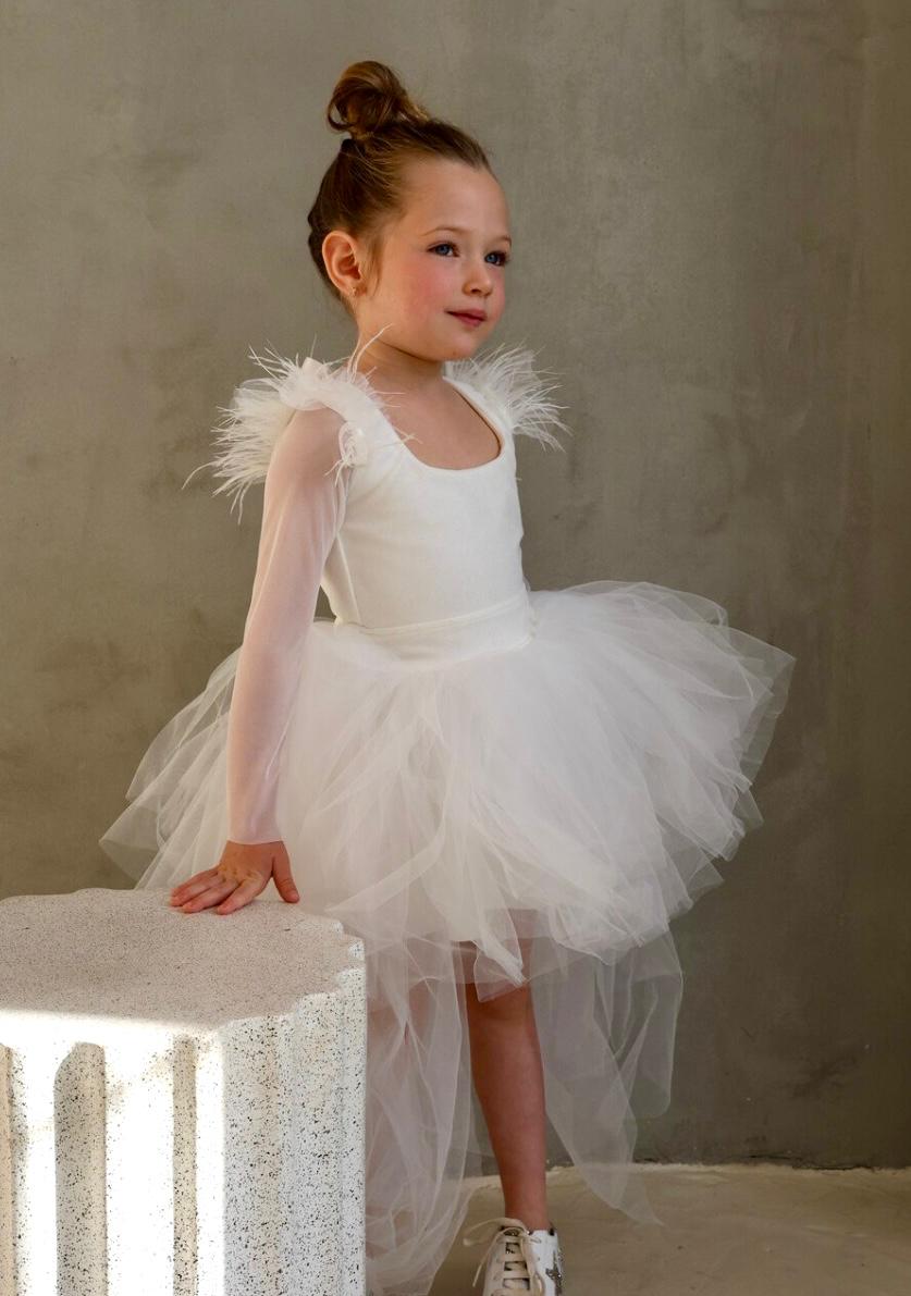 שמלת שושבינה טוטו מתופרת עם שובל טול מאחורה, שרוולי טיפול שיפון עדינים ואלמנט נוצות רכות משולבות טול בכתפיים, מחשוף אליפטי ומדויק בגב.